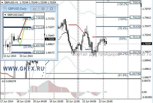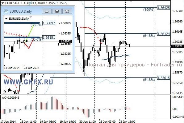 Пара EURUSD зажимается в треугольник, готовясь к выстрелу в какую либо сторону. Выходившая вчера статистика по еврозоне была не в пользу пары, а статистика по США оказалась довольно сильной. Из этого следует, что с этой точки зрения все не в пользу пары и выход из треугольника может произойти вниз. Однако после сильных данных по США пара закончила американскую сессию ростом, что указывает на нежелание направлять пару вниз. Сегодня выходят данные Ifo по Германии, возможно, они станут поводом для выхода из треугольника. На эту неделю традиционно рассматриваю два варианта возможного движения цены, основной красный и альтернативный зеленый. Значимые уровни на сегодня отмечены на часовом графике. Индикатор АО находится в положительной зоне и снижается, указывая на коррекцию перед возможным продолжением роста. Индикатор тренда указывает на рост. Преодоление уровня 1,3612 позволит купить с целями 1,3625, 1,3640 и 1,3670.