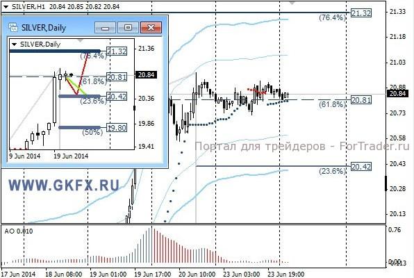 Цены на серебро торговались в диапазоне понедельника, зажимаясь в треугольник. Как и по золоту ожидаю выход вверх. Традиционно делаю два варианта движения цены на неделю, основной красный и альтернативный зеленый. Значимые уровни на сегодня отмечены на часовом графике. Индикатор АО находится у нуля, указывая на неопределенность. Индикатор тренда указывает на рост. Преодоление уровня 21,00 позволит купить с целями 21,10, и 21,30.