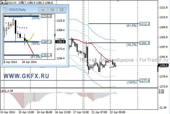 Цены на золото, как и предпологалось, торговались без особых изменений, не считая азиатских торгов. Сегодня рынок начнет приходить в норму и возможно снижение цен на золото продолжится. На этот случай даю рекомендацию. Традиционно делаю два варианта движения цены на неделю, основной красный и альтернативный зеленый. Значимые уровни на сегодня отмечены на часовом графике. Индикатор АО находится в отрицательной зоне и снижается, указывая на желание инструмента двигаться вниз в данное время. Индикатор тренда указывает на снижение. Преодоление 1282,0 позволит продать с целями 1278,0, 1270,0 и 1258,0.