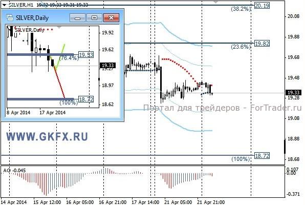 Цены на серебро удержались на текущих уровнях, не вернувшись выше 19,40. Это значит, что теперь можно рассмотреть продажи. Традиционно делаю два варианта движения цены на неделю, основной красный и альтернативный зеленый. Значимые уровни на сегодня отмечены на часовом графике. Индикатор АО находится в отрицательной зоне и снижается, указывая на желание инструмента двигаться вниз в данное время. Индикатор тренда указывает на снижение. Преодоление 19,20 позволит продать с целями 19,00, 18,70 и 18,00.