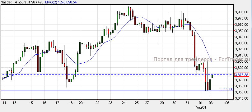 Американские индексы завершили торги пятницы в красной зоне после выхода слабого отчета Non-Farm Payrolls. NASDAQ упал на 0.30%, S&P 500 упал на 0.32%, а Dow Jones потерял от стоимости 1.88%. Согласно техническому анализу 4-часового графика, NASDAQ торгуется с нисходящим импульсом и не смог пробить уровень поддержки 3,852. Пока индекс торгуется выше уровня поддержки, ожидается его откат к отметке 3,950. Однако, при прорыве ниже уровня поддержки возможно падение к отметке 3,800.