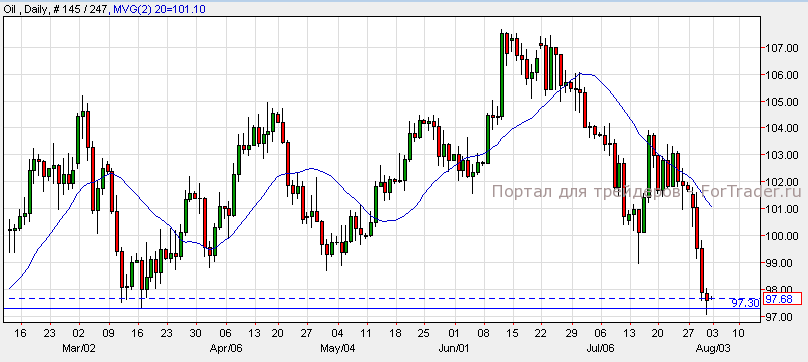 Нефть подешевела до $97.88 за баррель. Согласно техническому анализу дневного графика, нефть торгуется с нисходящим импульсом около уровня поддержки $97.30. Прорыв уровня поддержки станет причиной падения нефти к отметке $95.00. В противном случае, может начаться разворот тренда и рост к отметке $101.00.
