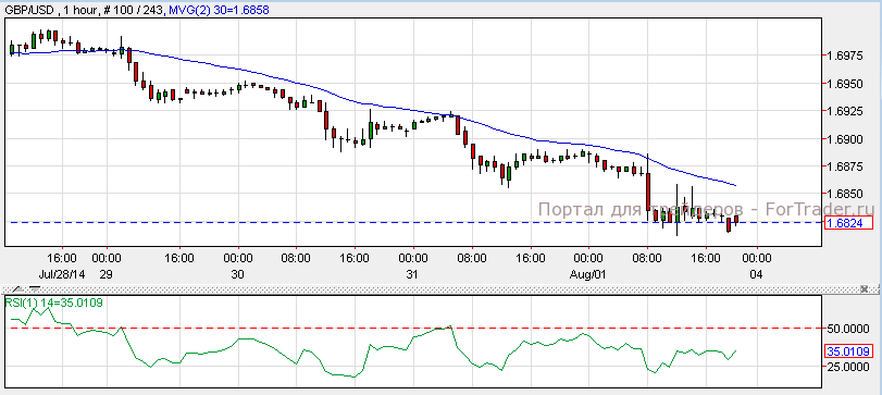 Фунт упал против доллара, поскольку индекс деловой активности в производственном секторе вышел хуже прогнозов и составил 55.4 против 57.2 ранее. Согласно техническому анализу 1-часового графика, пара торгуется с нисходящим импульсом и поддерживается 30-дневной скользящей средней. Задержка на данном уровне вызовет падение пары к отметке 1.6750, а при прорыве линии 30-дневной скользящей средней возможен откат пары к отметке 1.6950. Индекс деловой активности в строительном секторе ожидается на уровне 62.1.
