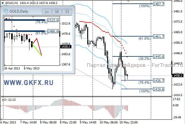 Цены на золото преодолели нижнюю границу диапазона, в котором находились более двух недель. По рекомендации цена немного не достигла точки входа. Судя по всему, идет формирование нового диапазона 1420.0-1440.0. На прошлой неделе отработал красный вариант движения цены на дневном графике. Традиционно делаю два варианта движения цены на неделю, основной красный и альтернативный зеленый. Значимые уровни на сегодня отмечены на часовом графике. Индикатор АО находится в отрицательной зоне и снижается, указывая на желание цены двигаться вниз. Индикатор тренда указывает на снижение. Смотрим за предпочтениями цены.
