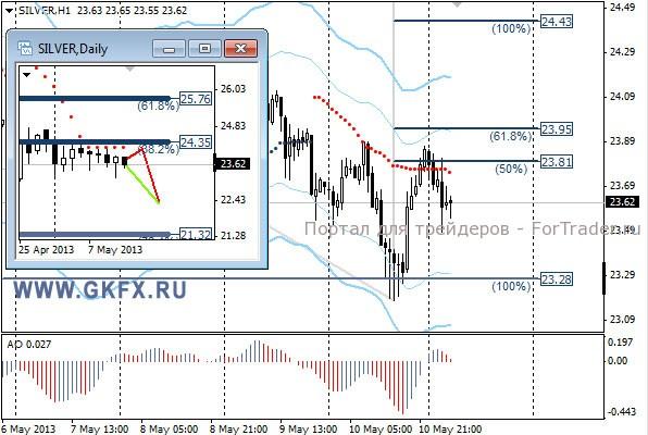 Цены на серебро снижались к предполагаемой отметке 23,25.Сегодня возможна консолидация в диапазоне 23,50-24,00. Традиционно делаю два варианта движения цены на неделю, основной красный и альтернативный зеленый. Значимые уровни на сегодня отмечены на часовом графике. Индикатор АО находится у нуля, указывая на неопределенность. Индикатор тренда указывает на снижение. Вне рынка.