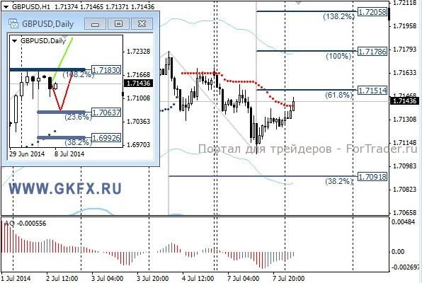 Пара GBPUSD в отличие от евро была склонна к снижению. Возможно, пара корректировала недавний рост, чтобы качественней его продолжить. Сегодня по Великобритании выходит статистика, которая может восстановить рост пары. На этот случай даю рекомендацию на покупку. На эту неделю традиционно рассматриваю два варианта возможного движения цены, основной красный и альтернативный зеленый. Значимые уровни на сегодня отмечены на часовом графике. Индикатор АО находится у нуля, указывая на неопределенность. Индикатор тренда указывает на снижение. Преодоление 1,7155 позволит купить с целями 1.7175, 1,7200 и 1,7220.