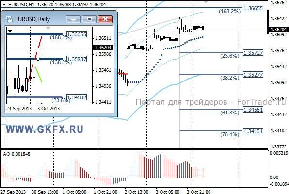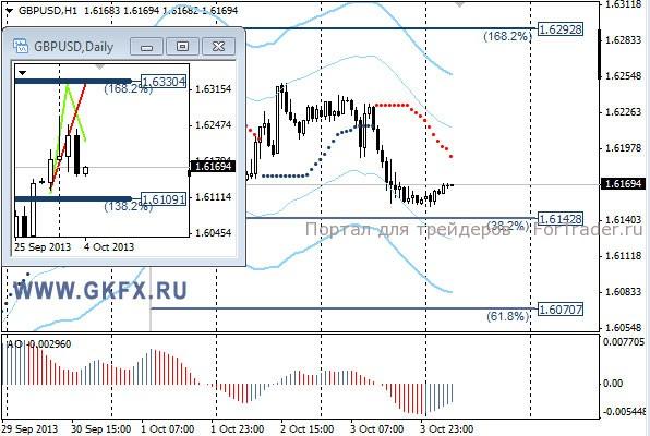 Пара EURUSD продолжила умеренный рост к новым максимумам с февраля этого года на фоне очередных слабых данных по США. Сервисный ISM оказался очень слабым и это указывает на возможную отсрочку сворачивания стимулирования экономики США. В тоже время по еврозоне были представлены данные по розничным продажам, которые порадовали. Пара вполне может сегодня дотянуть до 1,3665, потому как правительство США по-прежнему в тупике по поводу бюджета, а ключевое событие недели, данные по новым рабочим местам в США, отменено. На эту неделю традиционно рассматриваю два варианта возможного движения цены, основной красный и альтернативный зеленый. Значимые уровни на сегодня отмечены на часовом графике. Индикатор АО находится в положительной зоне и растет, указывая на желание пары направляться вверх в данное время. Индикатор тренда указывает на рост. Держим покупки от 1,3610 до цели 1,3665, можно перевести стоп в безубыток.