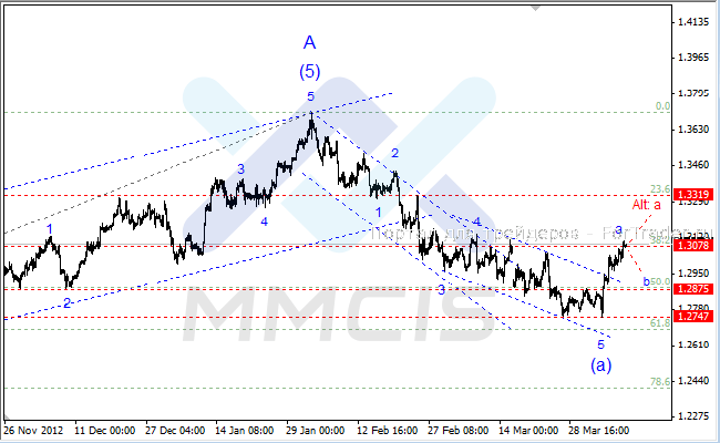 Поэтому в качестве основного сценария на ближайшие дни аналитики рассматривают возможность завершения волны «а» в районе текущих максимумов и начала коррекции курса в направлении 29-й фигуры в рамках волны «b». В качестве альтернативного сценария рассматривается вариант, при котором восходящее движение может продолжиться в виде усложненной структуры волны «Alt:a». При этом рост может продлиться вплоть до уровня 1.3270.