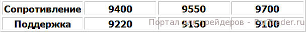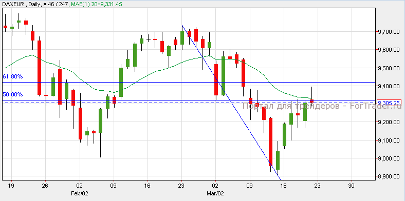 Индекс DAX 30 снизился в прошлую пятницу и закрылся ниже 50%-ного уровня коррекции Фибоначчи. Индекс торгуется на сильном уровне сопротивления 9,400. Задержка на этом уровне может вызвать падение индекса к отметке 9,100. Тем не менее, если DAX пробъет уровень сопротивления, возможен его рост к отметке 9,700.