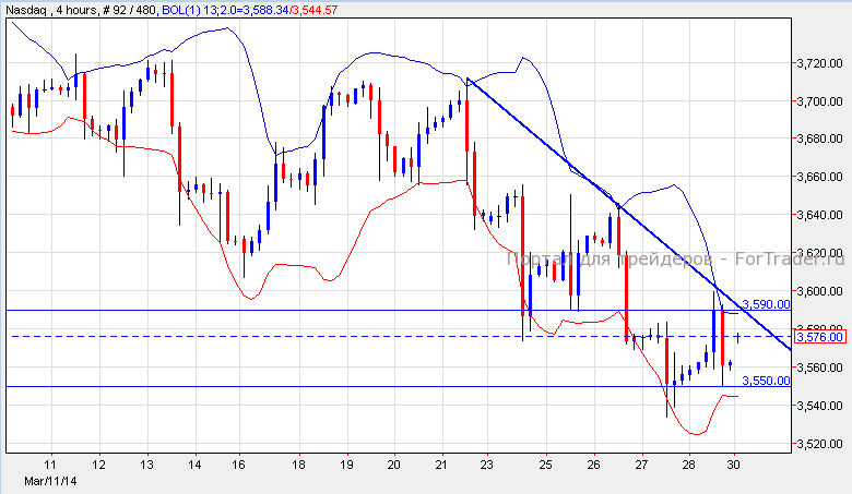 Уолл-стрит завершила торговую сессию прошлой пятницы в зеленой зоне на фоне выхода позитивной экономической статистики. Отчёт по личным расходам вышел согласно прогнозам и составил 0.3%. Несмотря на это, на прошлой неделе NASDAQ торговался с резким понижением, такого низкого уровня индекс не достигал с октября 2012 года. Цена упала на 2.8%, несмотря на прибавление к стоимости 0.23%. S&P 500 вырос на 0.46%, a Dow Jones вырос на 0.36%. Согласно техническому анализу 4-часового графика, NASDAQ торгуется с нисходящим трендом. Используя анализ с 13-периодной полосой Боллинджера, мы предполагаем, что индекс вырастет к уровню сопротивления 3,590 и от него начнет откат к уровню поддержки 3,550.
