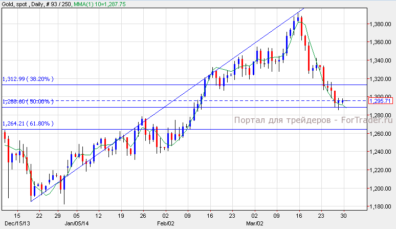 Золото подорожало на 0.15%, составив $1,295 за унцию. Согласно техническому анализу дневного графика, золото торгуется выше уровня поддержки $1,288, который совпадает с 50%-ным уровнем коррекции Фибоначчи. Цена может вырости к уровню сопротивления $1,312. Прорыв этого уровня вновь приведет золото к уровню поддержки. Однако, если золото не пробъет этот уровень, оно может продолжить снижение к отметке $1,264.