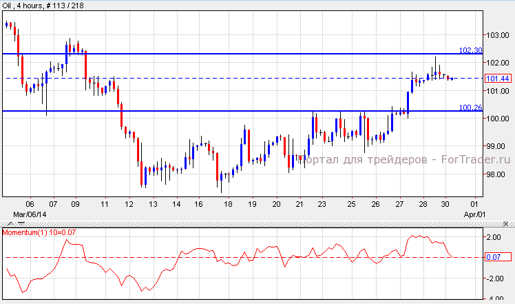 Нефть подорожала на 0.23% составив $101.60 за баррель на фоне признаков роста экономики США. Согласно техническому анализу 4-часового графика, нефть достигла уровня сопротивления $102.29 и начала откатываться. Если нефть задержится на этом уровне, она упадет к уровню поддержки $100.26. Индикатор Momentum также поддерживает нисходящий тренд.