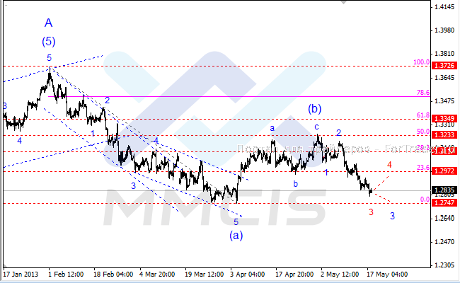 Поэтому в качестве основного сценария аналитики рассматривают возможность продолжения снижения котировок в район уровня 1.2747 в рамках волны «3» нисходящего импульса. В качестве альтернативного сценария рассматривается вариант, при котором третья волна завершилась в районе текущих минимумов и теперь можно ожидать восстановления курса выше отметки 1.29 в рамках коррекционной волны «4».