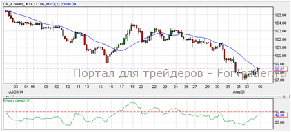 Нефть подорожала к цене $98.39 за баррель. Согласно техническому анализу 4-часового графика, нефть торгуется около линии 20-дневной скользящей средней. Прорыв выше данной линии может начать разворот тренда к отметке $102.00. Если черное золото не сможет пробить линию скользящей средней, возможно продолжение его нисходящего тренда и падение к отметке $95.00.
