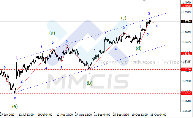 Поэтому основной сценарий на сегодня предполагает снижение котировок к отметке 1.3740 в рамках коррекционной волны «4» восходящего импульса старшего порядка. В качестве альтернативного сценария рассматривается вариант укрепления котировок в рамках усложненной волны «Alt:3». Целевым уровнем для данной волны может стать отметка 1.3840.