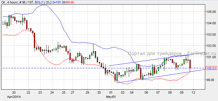 Нефть подешевела и закрылась на цене 100$ за баррель. Согласно техническому анализу 4-часового графика, нефть торгуется с восходящим импульсом и поддерживается индикатором полос Боллинджера. Черное золото может упасть к отметке 98.00$ если пробьет уровень поддержки 99.50$. Нефть может откатиться к отметке 105$ если продолжит восходящий импульс.