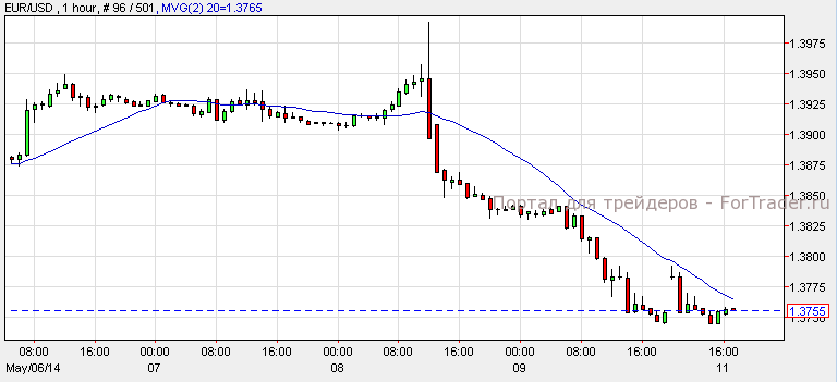 Евро подешевел на 0.62% против доллара и закрылся на отметке 1.3757. Согласно техническому анализу 1-часового графика, пара торгуется с нисходящим импульсом. Индикатор 20-дневной скользящей средней указывает на уровень сопротивления 1.3775, который также поддерживает тренд. Неудачная попытка пробить уровень сопротивления приведет пару к отметке 1.3700.