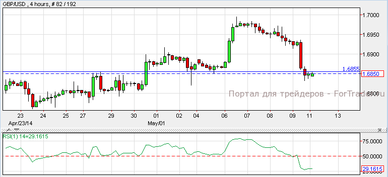 Фунт стерлингов подешевел против доллара, несмотря на то, что объем производства в обрабатывающей промышленности вышел лучше прогнозов. Согласно техническому анализу, пара GBP/USD торгуется с нисходящим импульсом, который поддерживается индикатором относительной силы. Пара пробила уровень сопротивления 1.6855. Пара может упасть к отметке 1.6800 если удержится на этом уровне.