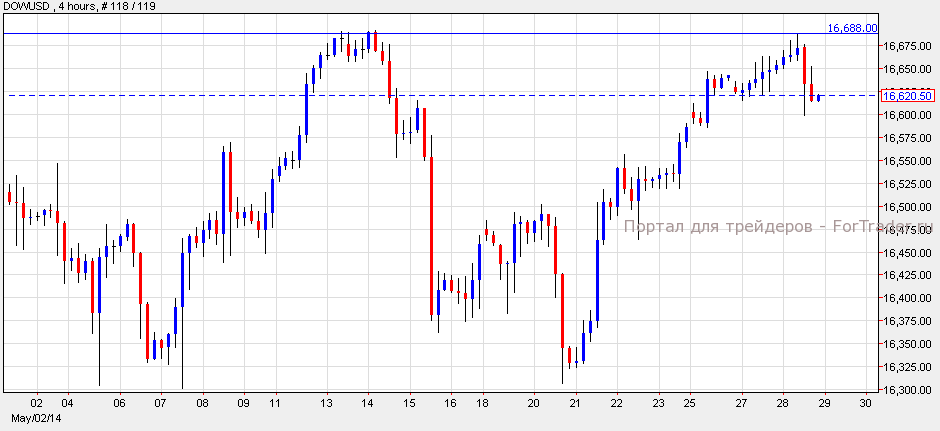 По итогам вчерашней сессии американские индексы снизились: Dow Jones упал на 0.25%, S&P 500 упал на 0.11%, а NASDAQ потерял 0.28%. Dow Jones не смог пробить уровень сопротивления 16,690 и может упасть к пунктам 16,550. Прорыв уровня сопротивления приведет индекс к отметке 16,750.
