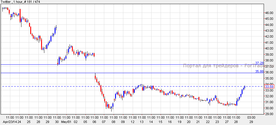 Акции Twitter взлетели на 10.69% и закрылись на цене $33.77, поскольку аналитики Nomura Group повысили рекомендацию по акциям микроблога Twitter на «покупать». Согласно техническому анализу 1-часового графика, акции торгуются с восходящим импульсом к уровню сопротивления $35.80. При прорыве этого уровня, акции закроют разрыв и вырастут к цене $37.00.