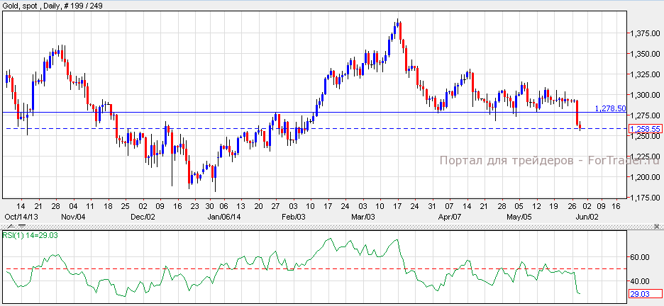 Золото подешевело на 0.51% составив $1259 за унцию в связи с ростом доллара. Согласно техническому анализу дневного графика, пока золото торгуется выше уровня сопротивления $1,278, а индикатор относительной силы находится выше уровня 50, золото может упасть к отметке $1250. Однако, при прорыве уровня сопротивления золото вернется к отметке $1,290.