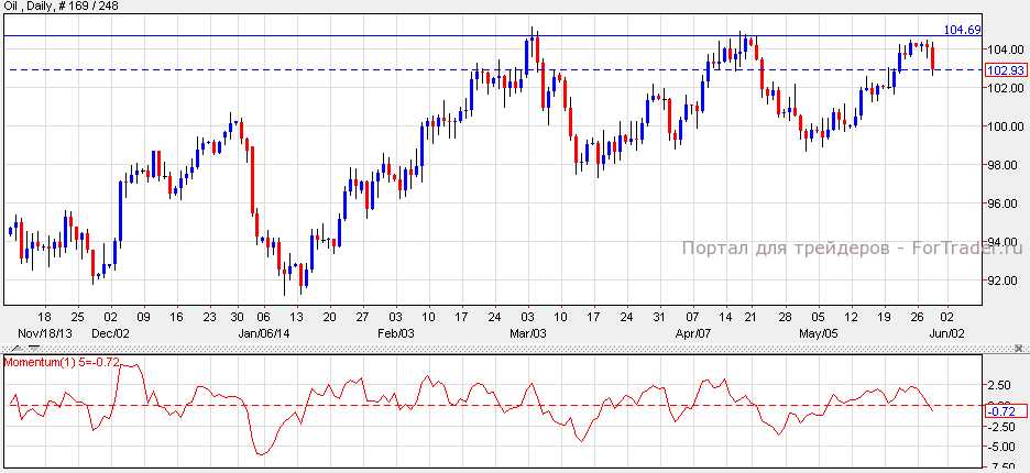 Нефть подешевела на 1.14% составив $102.92 за баррель. Согласно техническому анализу дневного графика, нефть не смогла пробить уровень сопротивления $104.50. Пока нефть торгуется ниже этого уровня, а индикатор Momentum находится ниже 0, черное золото может упасть к отметке $101.50. Запасы сырой нефти составят 0.1 млн против 7.2 млн ранее.