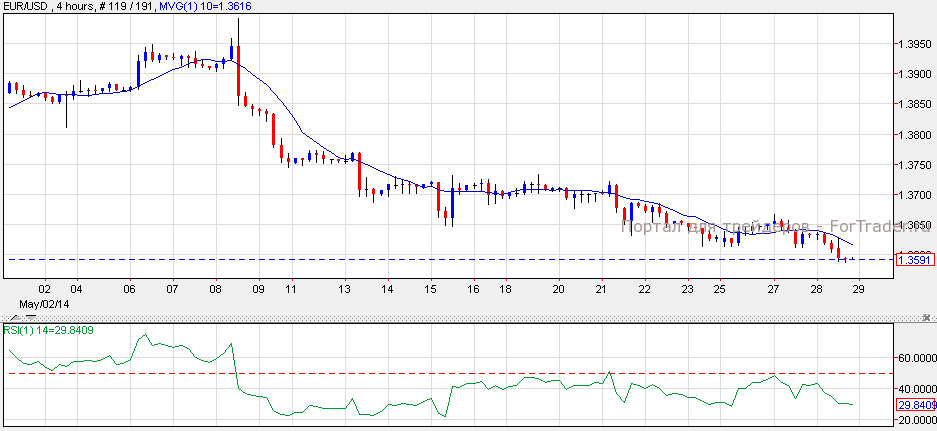 Евро упал против доллара на фоне выхода слабого изменения числа безработных в Германии и низкого показателя денежной массы М3. Согласно техническому анализу 4-часового графика, пока пара EUR/USD торгуется ниже 10-дневной скользящей средней, а индикатор относительной силы находится ниже уровня 50, возможно падение пары к отметке 1.3500. Однако, при прорыве выше скользящей средней, пара возобновит свой восходящий импульс.