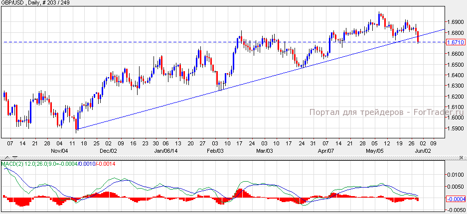 Фунт снизился против доллара поскольку баланс розничных продаж вышел хуже пара GBP/USD пробила линию восходящего тренда и может упасть к отметке 1.6650. Индикатор MACD упал ниже 0 и продолжает нисходящий импульс. Тем не менее, прорыв уровня 1.6750 может вновь привести пару к отметке 1.6800.