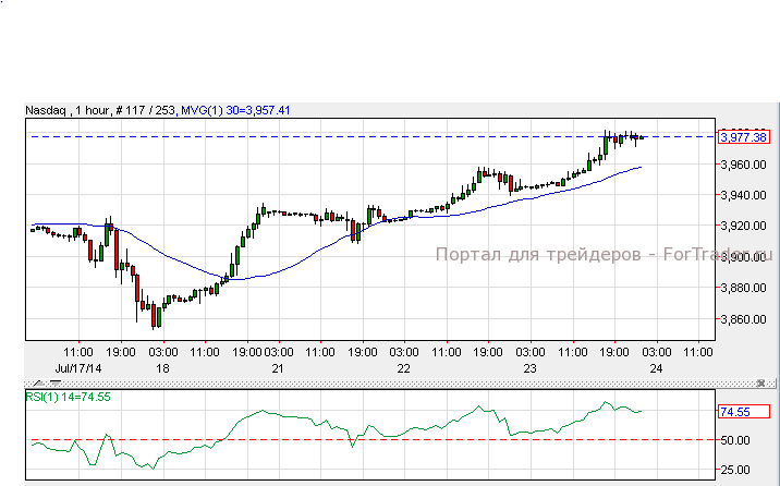 Американские индексы торговались смешано на фоне роста доходов крупных компаний во втором квартале. NASDAQ вырос на 0.40%, S&P 500 вырос на 0.18%, а Dow Jones потерял от стоимости 0.16%. Согласно техническому анализу 1-часового графика, NASDAQ торгуется с восходящим импульсом выше 30-дневной скользящей средней. Пока индекс удерживает текущий импульс, возможен его рост к отметке 4,020. Тем не менее, при прорыве ниже 30-дневной скользящей средней индекс может начать разворот тренда и упасть к отметке 3,900.
