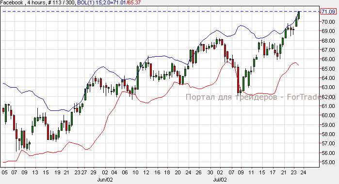 Акции Facebook выросли на 2.92% и закрылись на цене $71.29, поскольку финансовый отчет компании превысил все ожидания, прибыль Facebook выросла на 61% и составила 2.91 миллиарда. Согласно техническому анализу 4-часового графика, акции торгуются с восходящим импульсом около верхней полосы Боллинджера. Прорыв данной полосы приведет акции к цене $75.00, однако они могут упасть к цене $65.00 если пробьют нижнюю полосу.