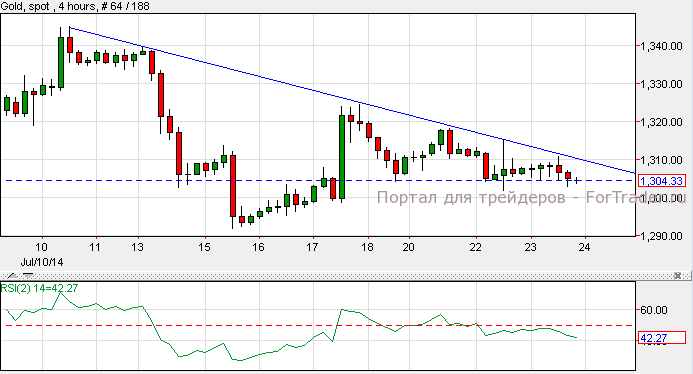 Золото подешевело до $1304 за унцию. Согласно техническому анализу 4-часового графика, золото торгуется с нисходящим импульсом. Задержка текущего импульса приведет к падению золота к отметке $1,290, а прорыв уровня сопротивления вернет драгоценный металл к отметке $1,320.