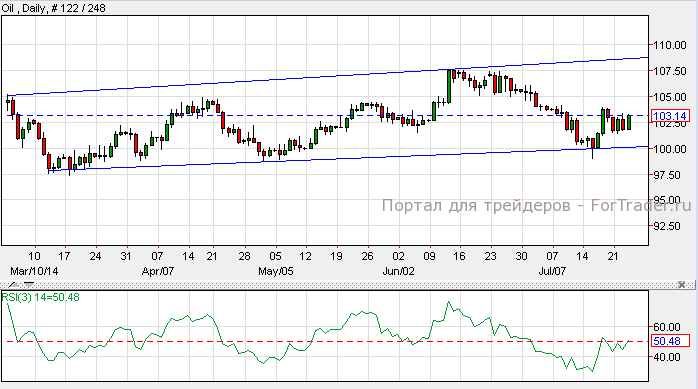 Нефть подешевела до $103.17 за баррель, так как запасы сырой нефти составили -4.0 млн против -7.5 млн ранее. Согласно техническому анализу дневного графика, нефть торгуется в канале. Прорыв верхней стороны канала приведет нефть к отметке $110, а падение с прорывом нижней стороны может стать причиной снижения черного золота к отметке $96.00.
