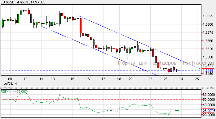 Евро упал против доллара и закрылся на отметке 1.3460. Согласно техническому анализу 4-часового графика, пара EUR/USD торгуется в нисходящем канале. Пока пара удерживает текущий импульс, возможно её падение к отметке 1.3400. Тем не менее, прорыв верхней стороны нисходящего канала может стать причиной разворота тренда и роста пары к отметке 1.3500. Промежуточный индекс деловой активности в производственном секторе выйдет на уровне 52.0 против 51.8 ранее.