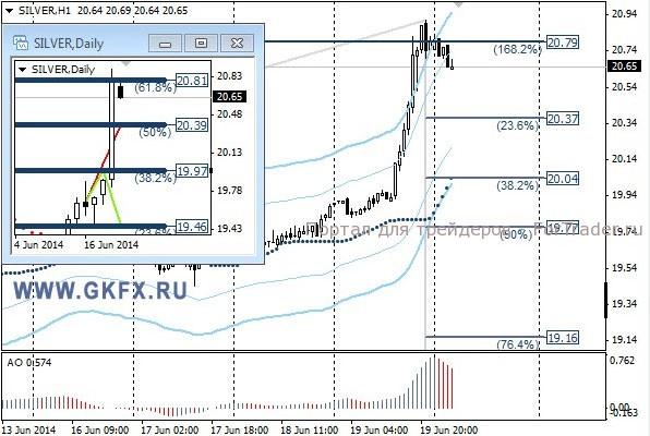 Цены на серебро возобновили рост, не выполнив ожидаемый откат вниз. В итоге сделка на продажу по рекомендации не исполнилась. Резкий рост драгметаллов обусловлен закрытием коротких позиций. Сегодня ожидаю консолидацию. Традиционно делаю два варианта движения цены на неделю, основной красный и альтернативный зеленый. Значимые уровни на сегодня отмечены на часовом графике. Индикатор АО находится в положительной зоне и снижается, указывая на коррекцию перед возможным продолжением роста. Индикатор тренда указывает на рост. Вне рынка.