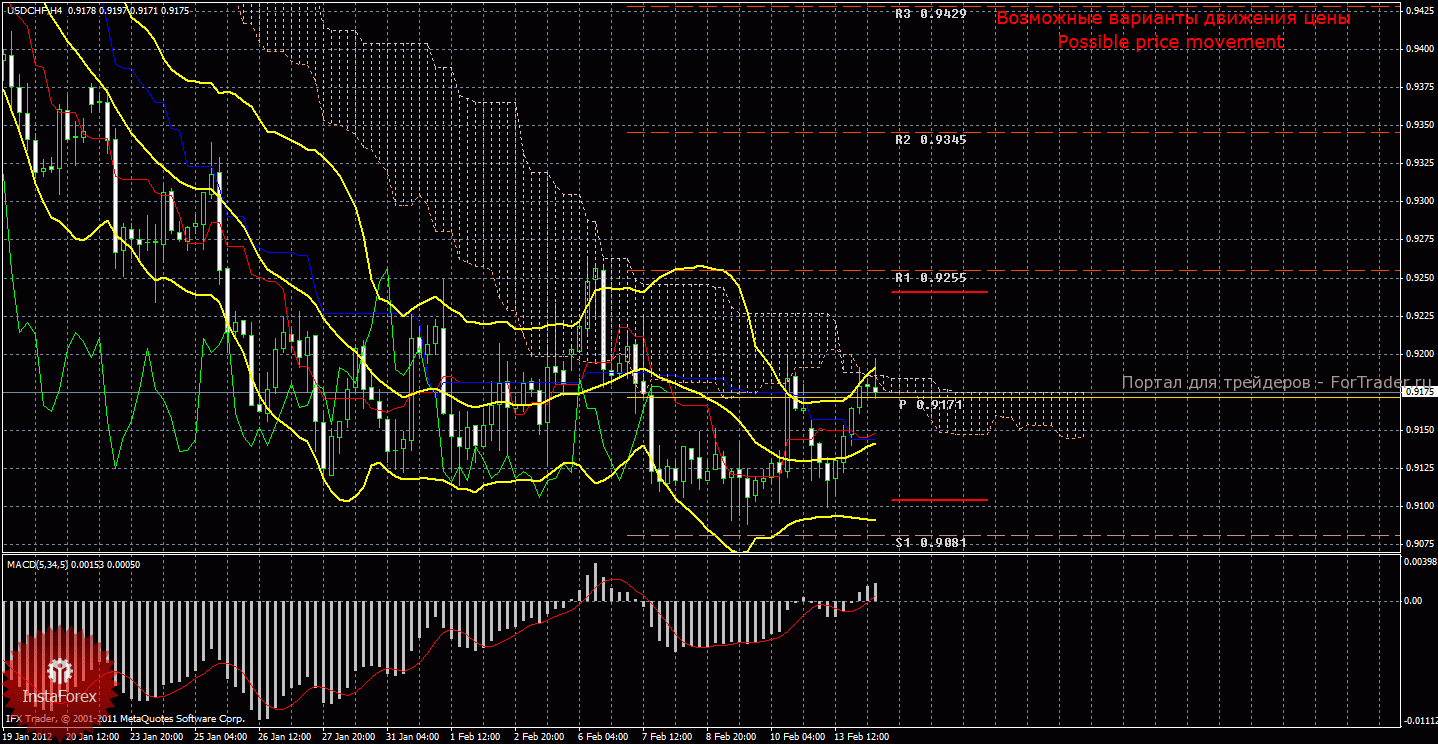14 февраля пара доллар/франк по-прежнему не может преодолеть нижнюю границу бокового канала и немного повысилась, однако, все -таки находится внутри бокового канала. В условиях бокового движения Ишимоку формирует ложные сигналы и не отрабатывает цели торговли, поэтому сейчас лучше воздержаться от входа в рынок до начала трендового движения. Цена находится зажатой в канале между уровнями 0,9105 и 0,9243. Рассматривать торговлю на понижение можно будет ниже первого уровня поддержки 0,9081 с целью 0,8997. Но пока что курс двигается вдоль нижней линии бокового канала, изредка повышаясь. Попытка на прошлой неделе прорваться сквозь нижнюю границу флэта не увенчалась успехом. Боллинджер Бандс показывает боковое движение, полосы расширяются и направлены вбок, поэтому в целом сейчас рекомендуется оставаться вне рынка. MACD повышается, что свидетельствует о текущем восходящем движении в рамках бокового канала, большинство других индикаторов указывают на флэт.