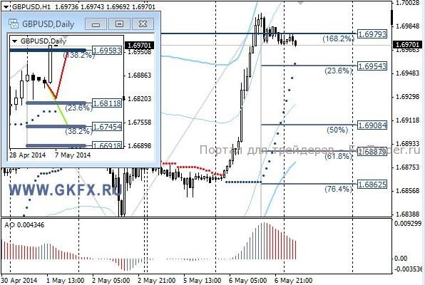 Пара GBPUSD слишком агрессивно выплеснула энергию во вторник и направилась в сторону 1,7000, немного не достигнув этой отметки. Рост ожидался, но более умеренный. Точка кипения видимо настала, и я ее пропустил. Сегодня можно ожидать коррекции, поэтому лучше не лезть в рынок. На эту неделю традиционно рассматриваю два варианта возможного движения цены, основной красный и альтернативный зеленый. Значимые уровни на сегодня отмечены на часовом графике. Индикатор АО находится в положительной зоне и снижается, указывая на коррекцию перед возможным продолжением роста. Индикатор тренда указывает на рост. Вне рынка.