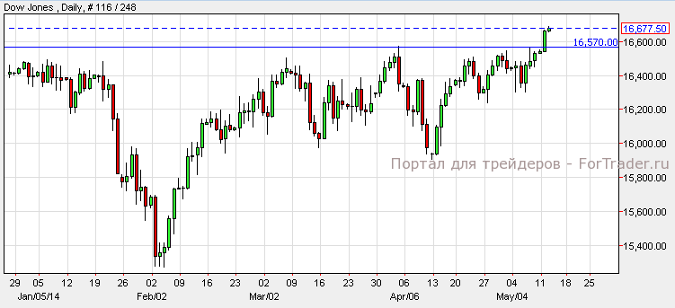 Уолл-стрит завершила торговый день вторника смешано в связи с выходом слабого объема розничных продаж. NASDAQ потерял от стоимости 0.33%, Dow Jones вырос на 0.12% а S&P добавил к стоимости 0.04%. Согласно техническому анализу дневного графика, восходящий импульс индекса Dow Jones пробил уровень сопротивления 16,570 и достиг рекордного внутридневного максимума. С восходящим импульсом индекс вырастет к отметке 16,800. Однако, если индекс опустится ниже уровня сопротивления, он упадет к отметке 16,500.