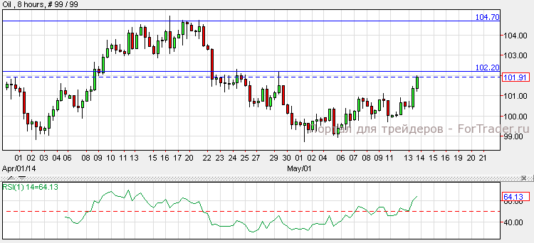 Нефть подорожала на 1.42% составив 101.94$ за баррель. Согласно техническому анализу 8-часового графика, нефть торгуется с восходящим импульсом и поддерживается индикатором относительной силы. Если нефть пробьет уровень сопротивления 102.20$, цена протестирует новый уровень сопротивления 104.70$. Если черное золото не сможет пробить уровень сопротивления, цена упадет к отметке 99.00$. Запас сырой нефти составит -0.4 миллиона против -1.8 миллиона ранее.