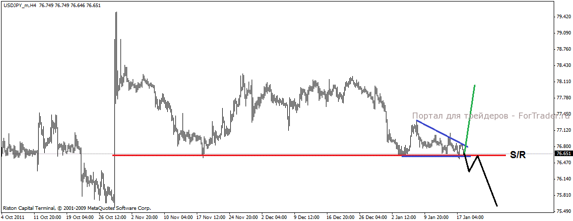 Цена вновь отбилась от уровня поддержки, однако пробить треугольник не смогла и вновь начала снижаться. В данной ситуации пара может пойти как вверх, так и вниз. Поэтому лучше дождаться пробоя треугольника, обозначенного синим цветом и открываться в сторону пробоя.