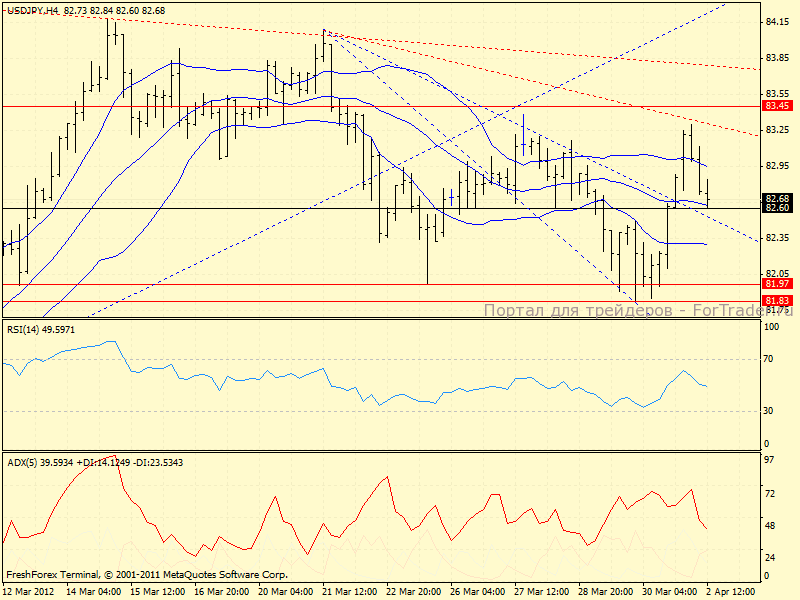 H4: пара в боковике 81.97-83.45, в данный момент разбирается с поддержкой от средней линии Боллинджера 82.60. Если поддержка не устоит, то следующей станцией сижения станет 82.25 и 81.97. Если поддержка таки устоит, то мы увидим новое тестирование 83.00.