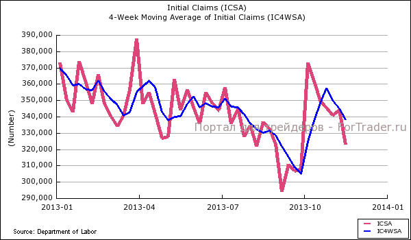 Вышедшие в четверг данные по США носили в целом позитивный характер. Число первичных заявок на пособие по безработице на прошлой неделе снизилось на 21 тыс. до 7-недельного минимума на уровне 323 тыс, более чем в два раза превысив ожидания снижения. Показатель, который сглаживает волатильность еженедельных данных — среднее число обращений за пособием за последние 4 недели, уменьшилось до уровня 338,5 тыс. с 344 тыс.