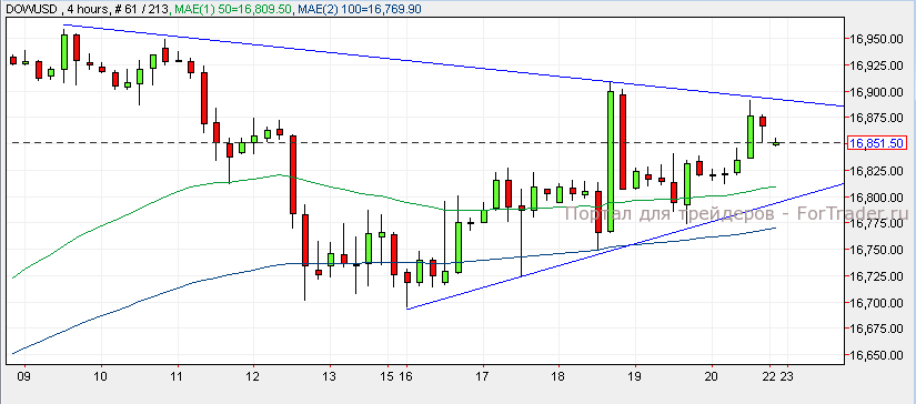 Американские фондовые рынки завершили сессию пятницы в зеленой зоне. NASDAQ прибавил к стоимости 0,05%, Dow Jones вырос на 0,15%, а S&P 500 укрепился на 0,17%. Согласно техническому анализу, индекс Dow Jones торгуется в восходящем импульсе, а согласно анализу 4-х часового графика, индекс сформировал симметричный треугольник. Пребывание выше уровня 16,800 поддержит восходящий импульс, а пробой отметки 16,900 может привести индекс Dow Jones в район отметки 17,000. Падение ниже уровня 16,800 может вернуть индекс в район отметки 16,700.