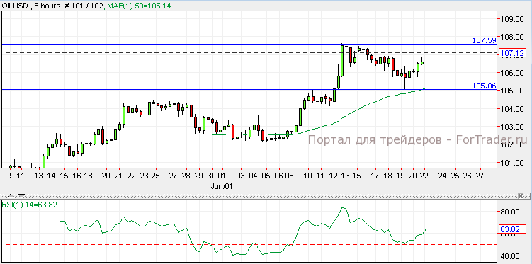 Нефть торгуется в восходящем импульсе, ввиду критической ситуации в Ираке. Согласно техническому анализу 8-часового графика, пробой уровня сопротивления $ 107.60 вверх может привести нефть в район отметки $ 109, а падение ниже уровня $ 105 может вернуть нефть в район отметки $ 103.