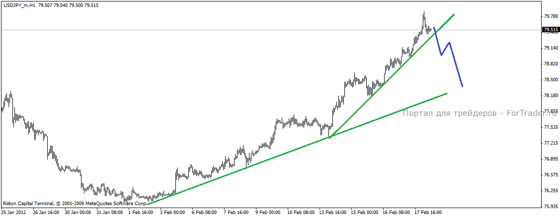 Доллар/йена начала разворачиваться. В дальнейшем нас очевидно ждет продолжение снижения пары, однако для открытия позиций на продажу, лучше дождаться пробоя линии тренда.