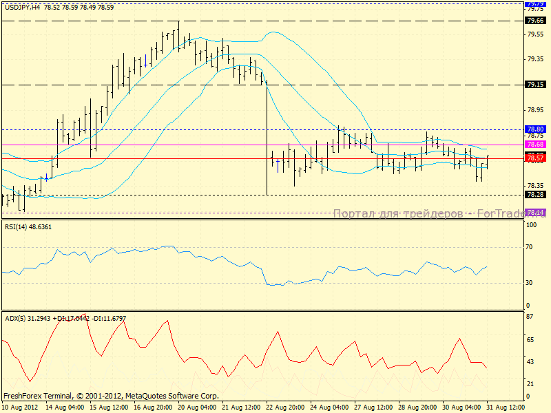 Часовой график: пара вошла в боковой диапазон 78.28-78.80. Комбинация индикаторов такова, что он (диапазон) будет, скорее, сохранен, чем пробит.