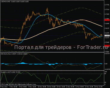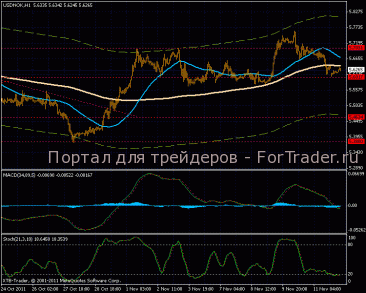 На часовом графике боковой тренд продолжается, верхняя граница канала не была протестированной, что подтверждает некое ослабление «быков». Линии скользящих средних движутся практически горизонтально, индикатор MACD в районе нуля, с большей вероятность спустится вниз.