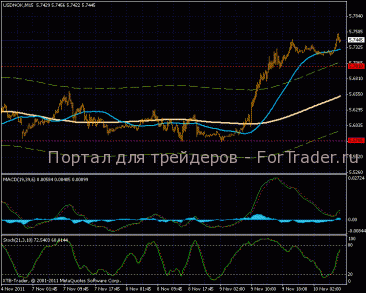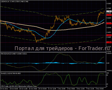 На часовом графике формирование восходящей тенденции, линии МА направлены вверх, цена подходит к верхней границе канала, где можно ожидать первые откатные движения. Индикатор MACD растет в положительной зоне, стохастический осциллятор перекуплен.
