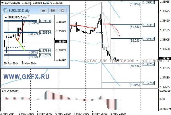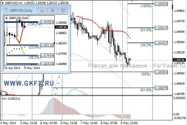 Пара EURUSD резко снизилась на обещаниях ЕЦБ приступить к действиям в июне. Похоже, Трише применил новую тактику для удержания роста евро и это у него получилось. На деле по-прежнему ничего не сделано, а курс евро снижается. Рекомендаций не давал, потому что во время таких событий стоп поставить некуда, везде зацепят. Риск высок. По сути, в такие периоды вход нужно выполнять после первых 5-10 мин публикации новости, тогда можно определиться со стопом. На эту неделю традиционно рассматриваю два варианта возможного движения цены, основной красный и альтернативный зеленый. Значимые уровни на сегодня отмечены на часовом графике. Индикатор АО находится в отрицательной зоне и растет, указывая на коррекцию перед возможным продолжением снижения. Индикатор тренда указывает на снижение. Вне рынка.