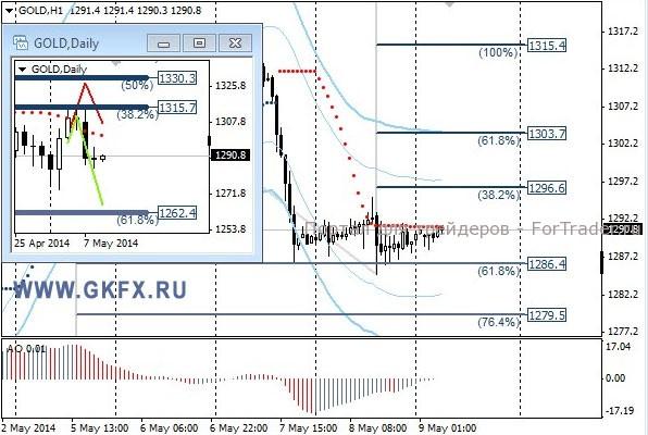Цены на золото замерли в ожидании поводов для дальнейшего движения. Повышающаяся конструкция не сломлена, поэтому рост еще может возобновиться. Прошедшее второй день выступление председателя Йеллен ничего нового не принесло, поэтому не оказало влияния на золото. Ситуация на Украине остается напряженной, но по всей видимости для рынка это пока не интересно. В воскресенье будет проведен референдум в Луганской и Донецкой областях, по итогам которых станет ясно, чего ожидать далее. Сегодня динамика будет подобна вчерашней, если не поступит каких-либо серьезных новостей. Традиционно делаю два варианта движения цены на неделю, основной красный и альтернативный зеленый. Значимые уровни на сегодня отмечены на часовом графике. Индикатор АО находится у нуля, указывая на неопределенность. Индикатор тренда указывает на снижение. Вне рынка.