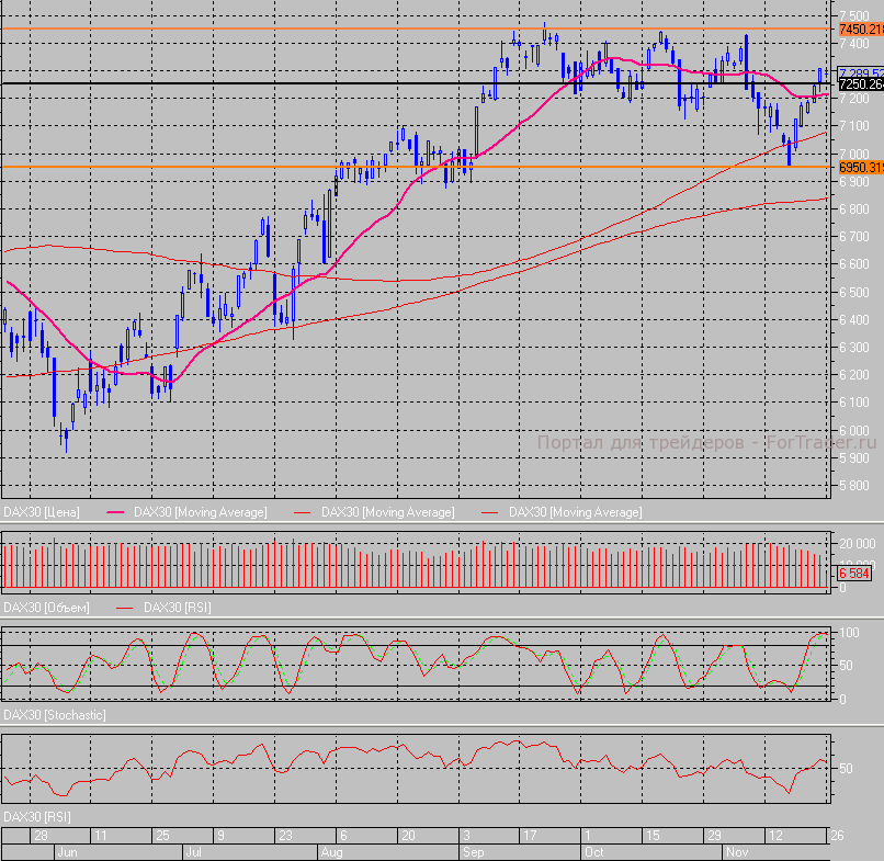 Котировки немецкого индекса DAX балансируют сегодня в диапазоне 7280-7300 пунктов, при этом пока индикатору не удается закрепиться на верхней границе коридора. С другой стороны, утренний негативный «гэп» дает надежду на его закрытие и выход к 7310 пунктам.